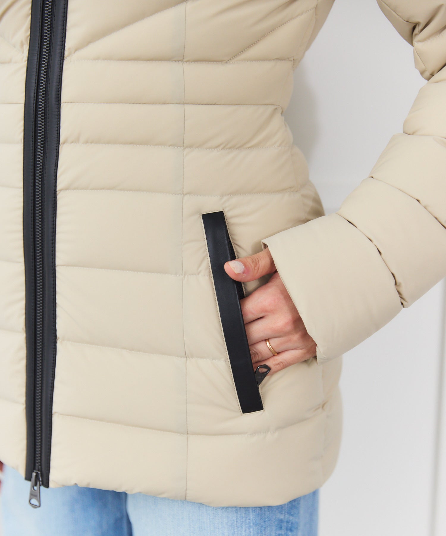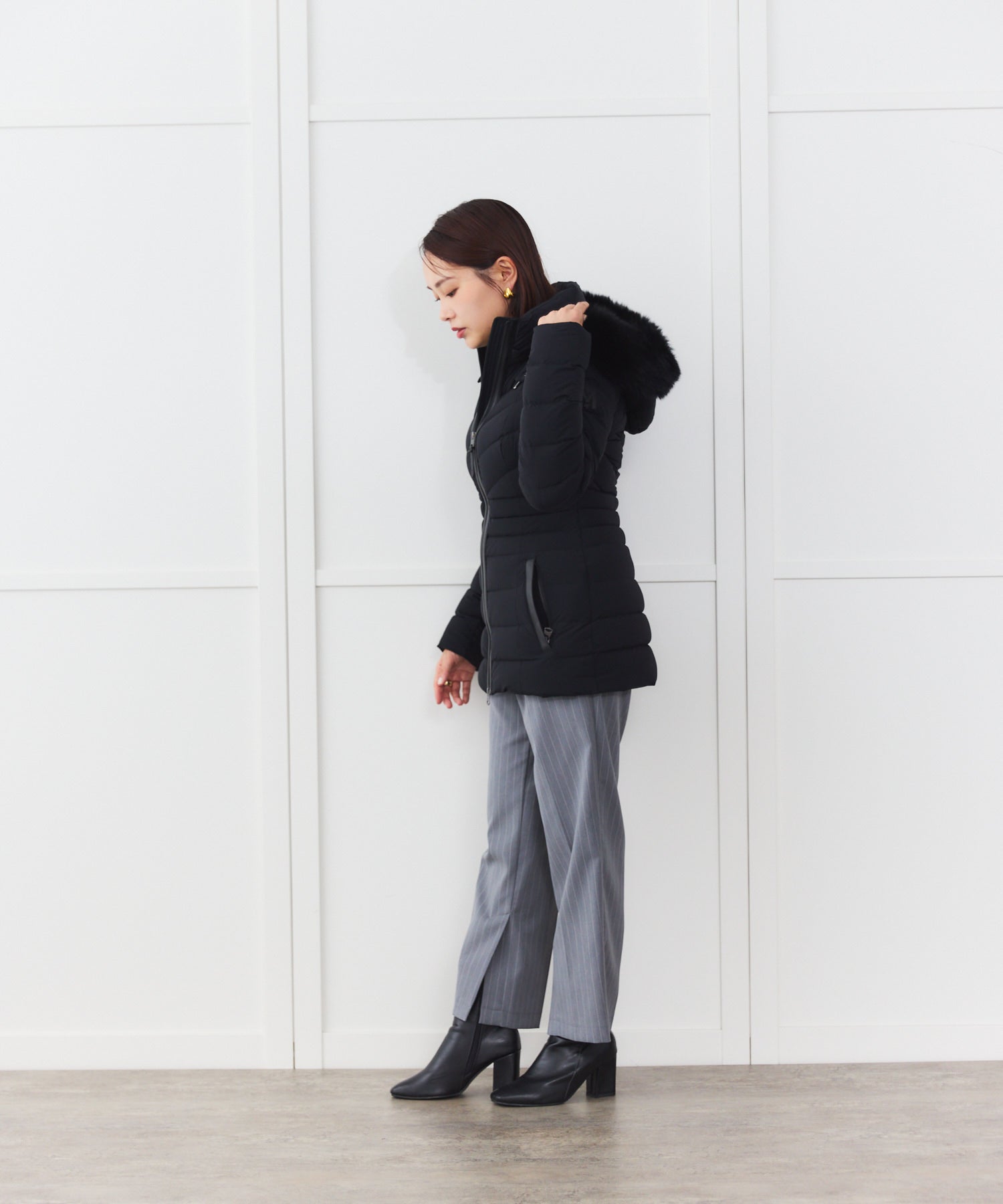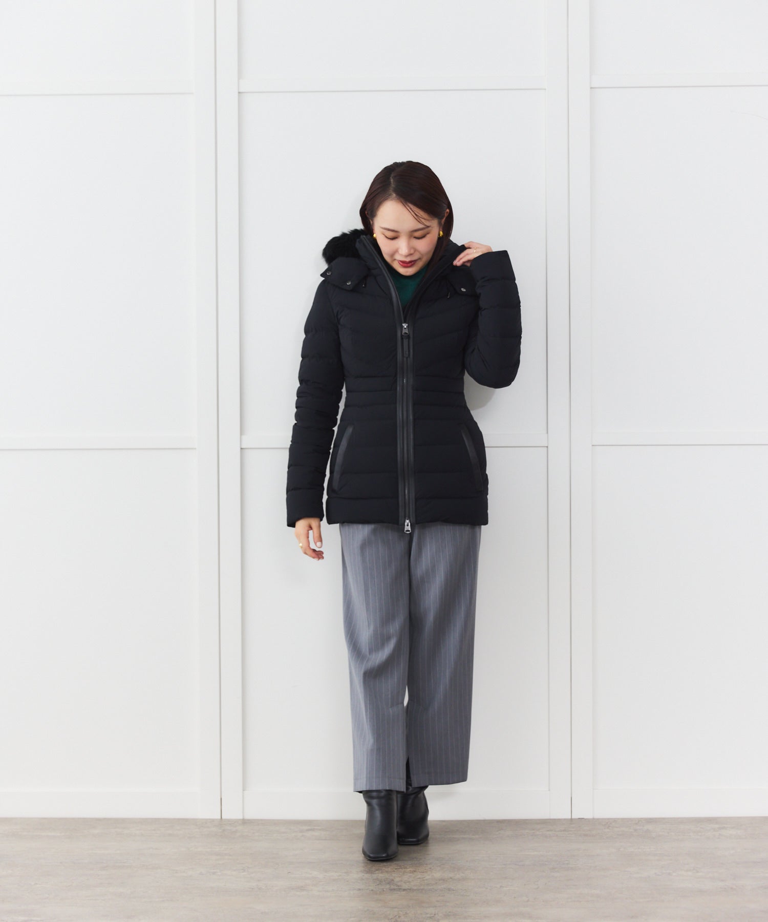 着ぶくれしない細見えシルエット。V字に施されたステッチやウエスト周り
