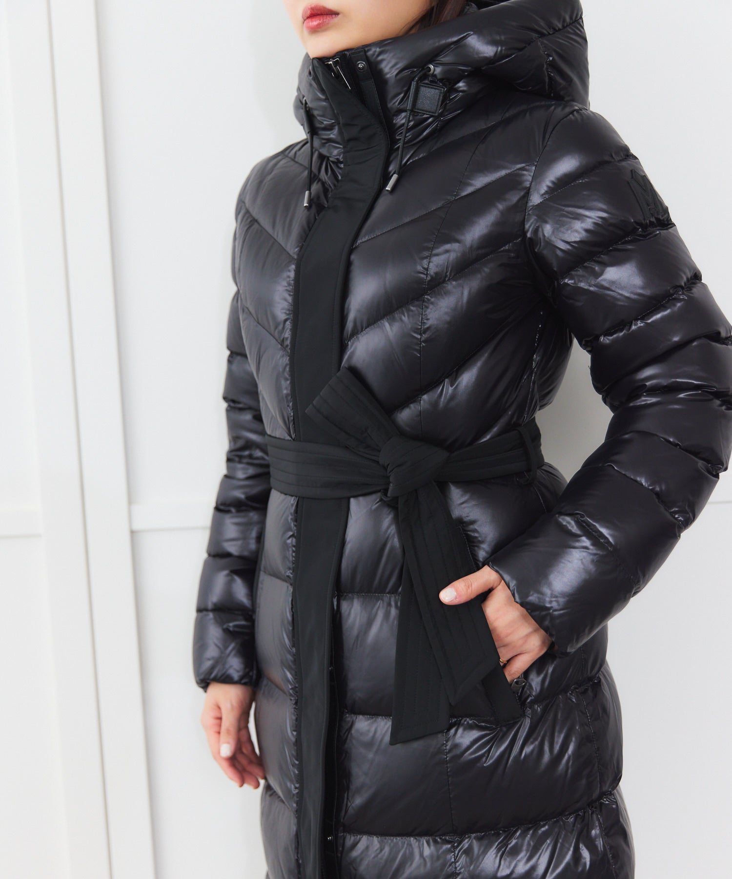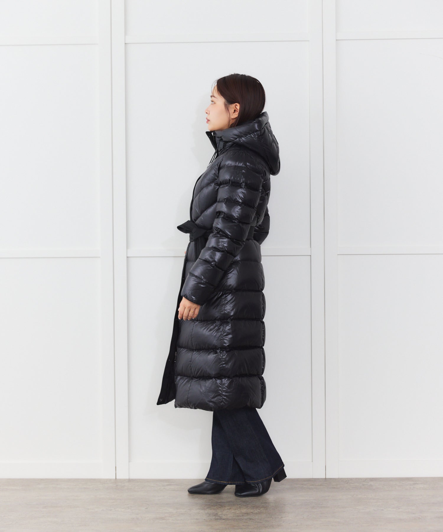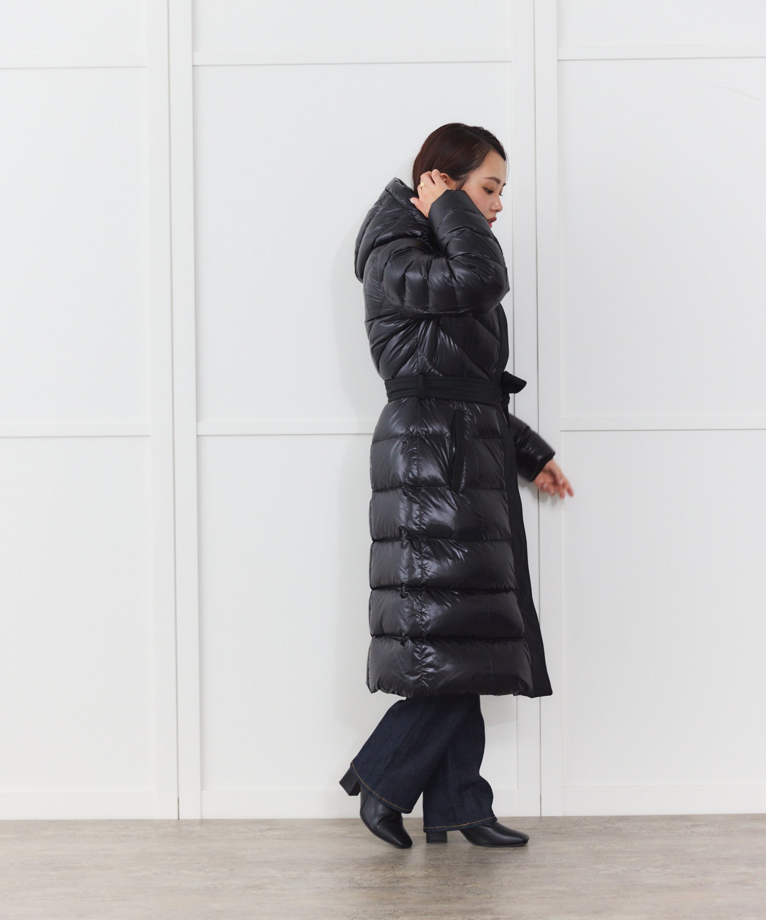 寒い季節をエレガントに包み込む、ウエストベルト付きロングダウンコート。