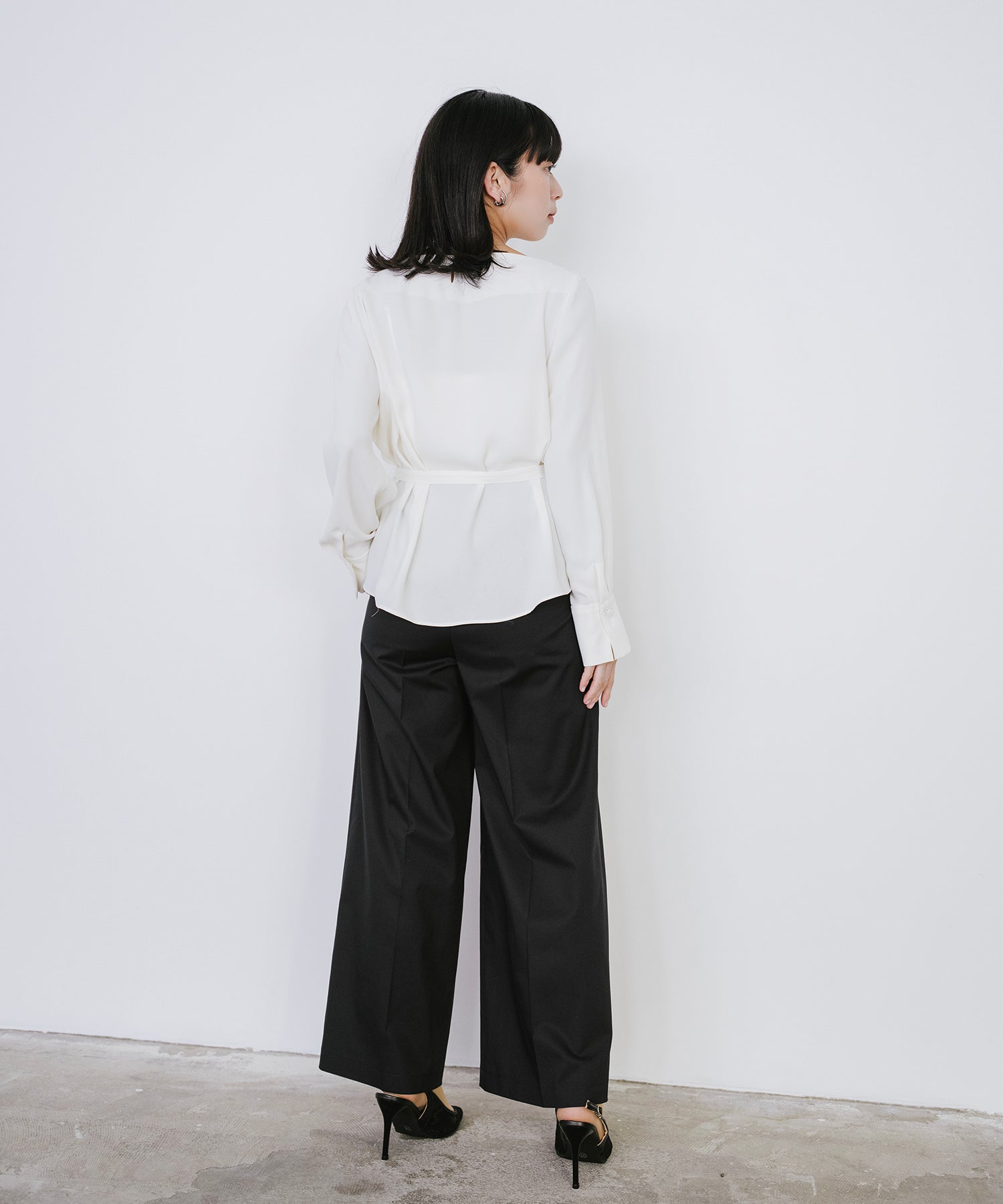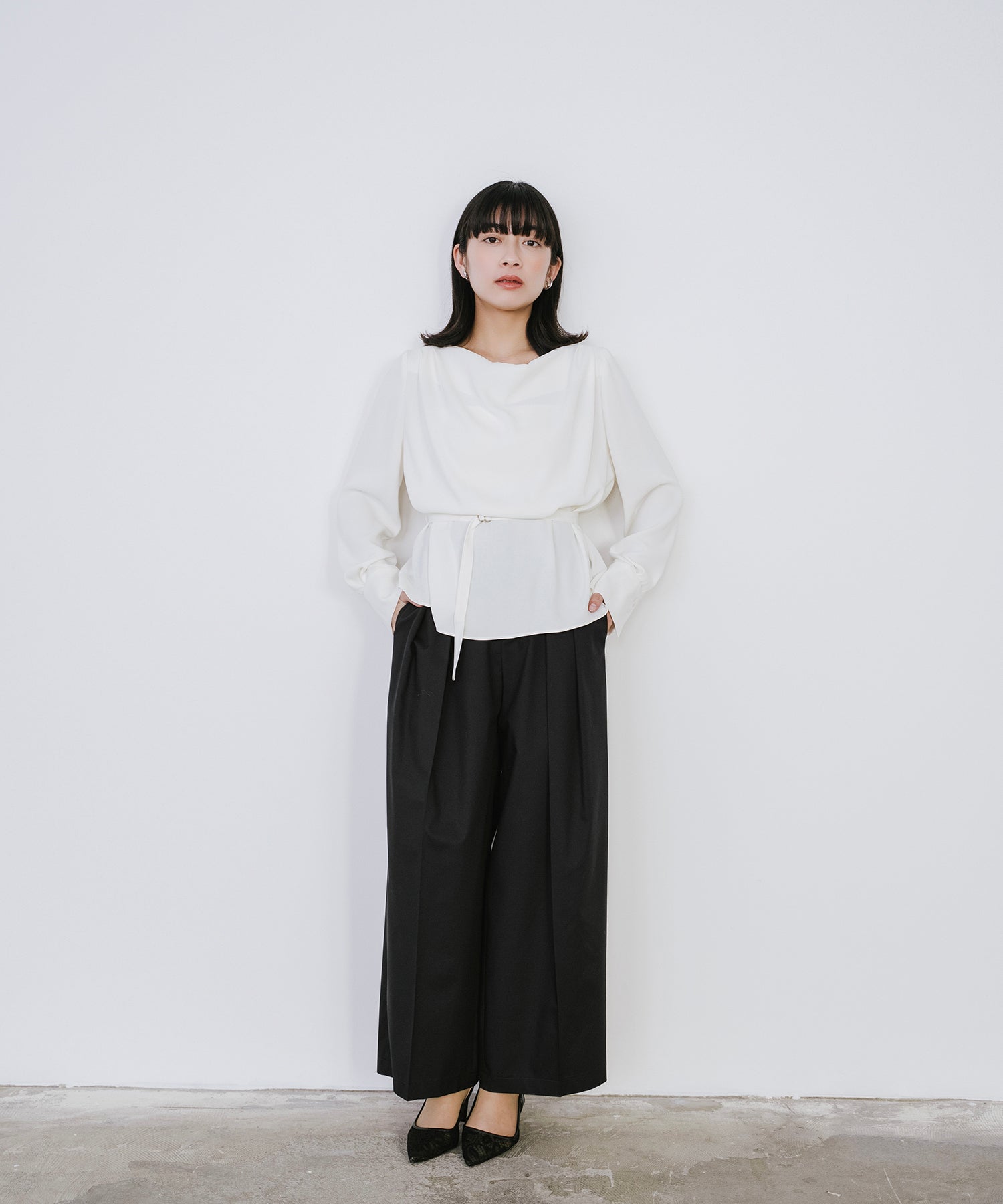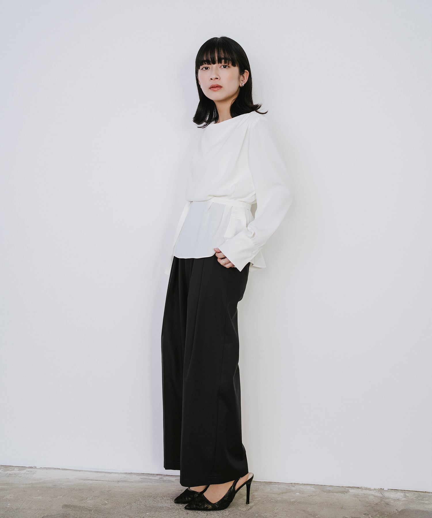 共布ベルトがアクセントになり、ウエストインのスタイリングも腰回りをすっきり魅せてくれます。