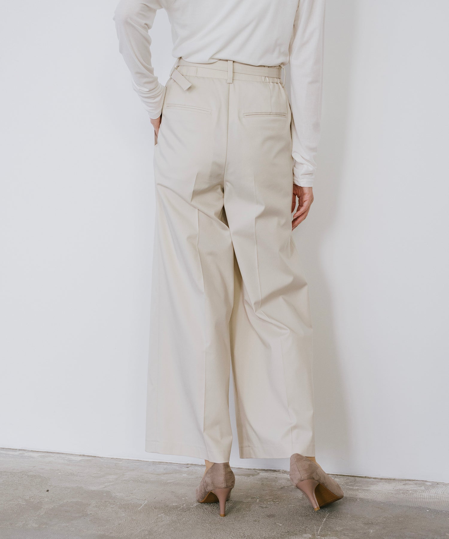 腰から両サイド2本ずつタックを入れることで、程よいゆとりと立体感を持たせ、脚のラインを拾いにくいシルエットに仕上げました。