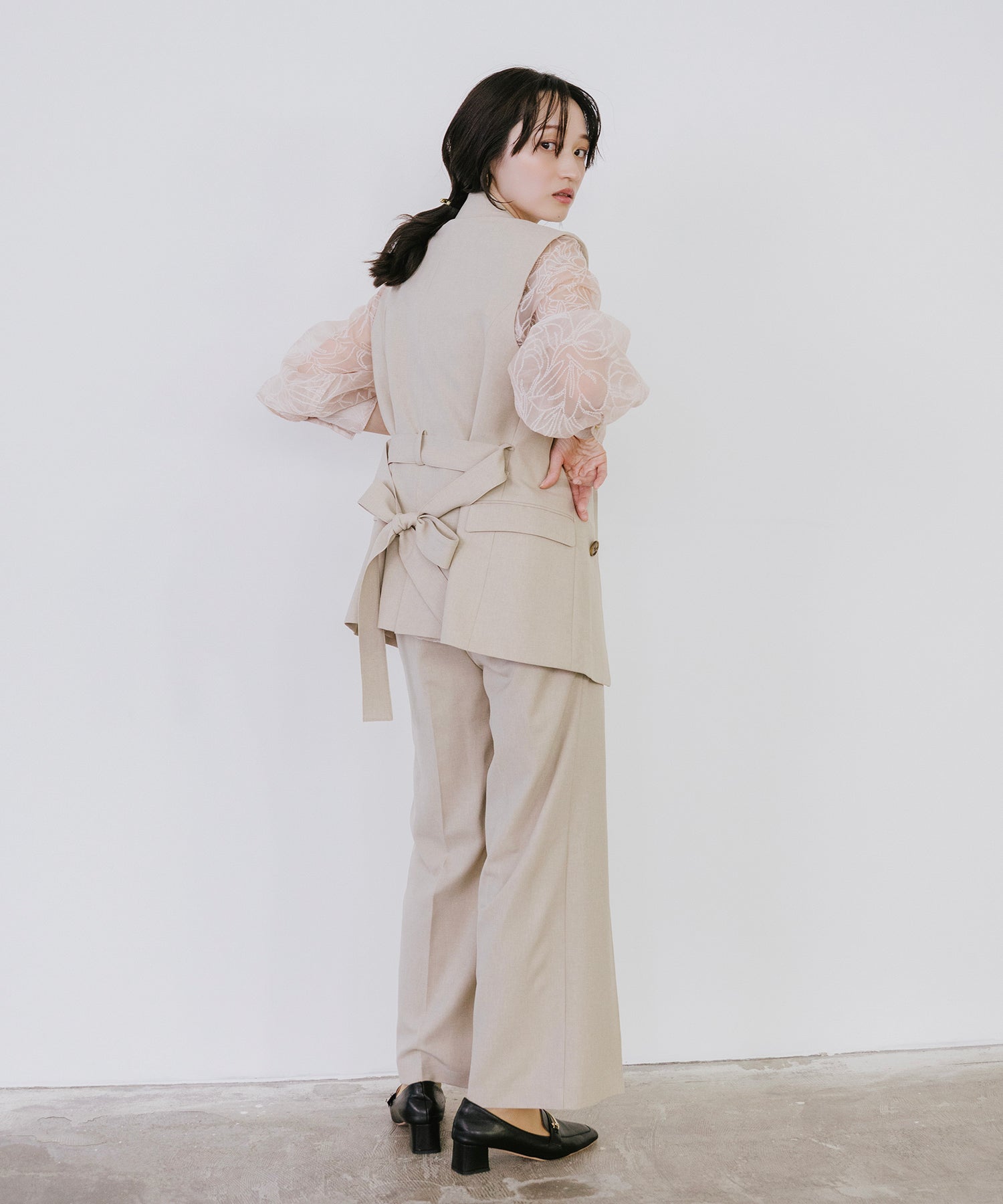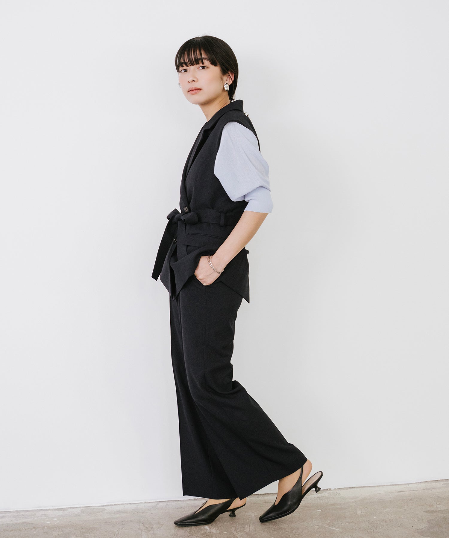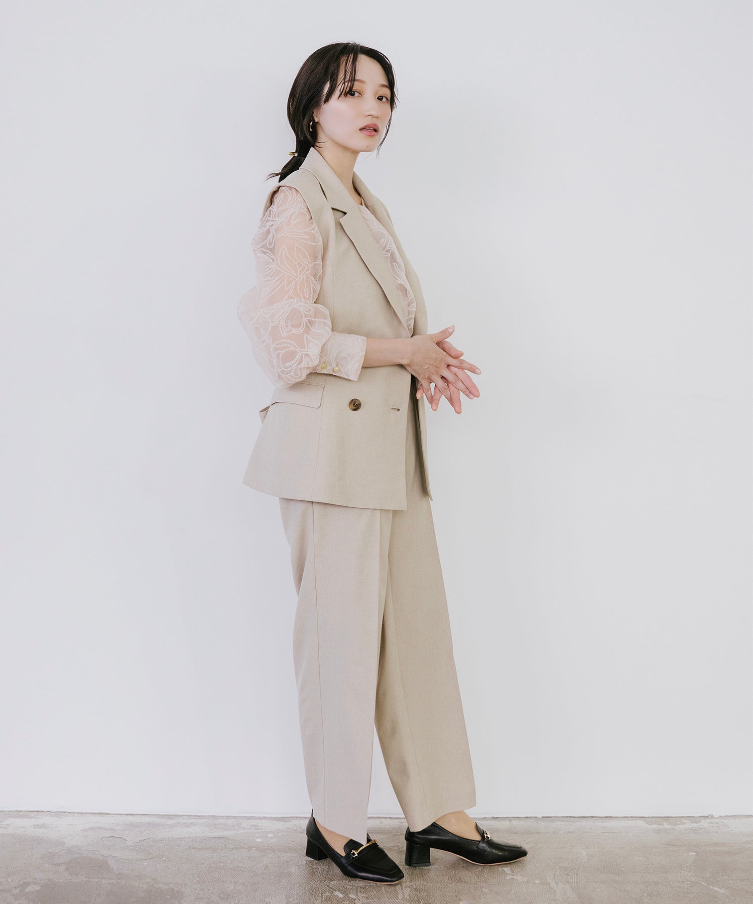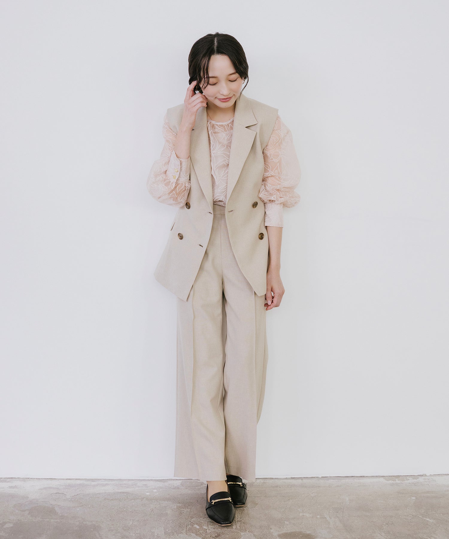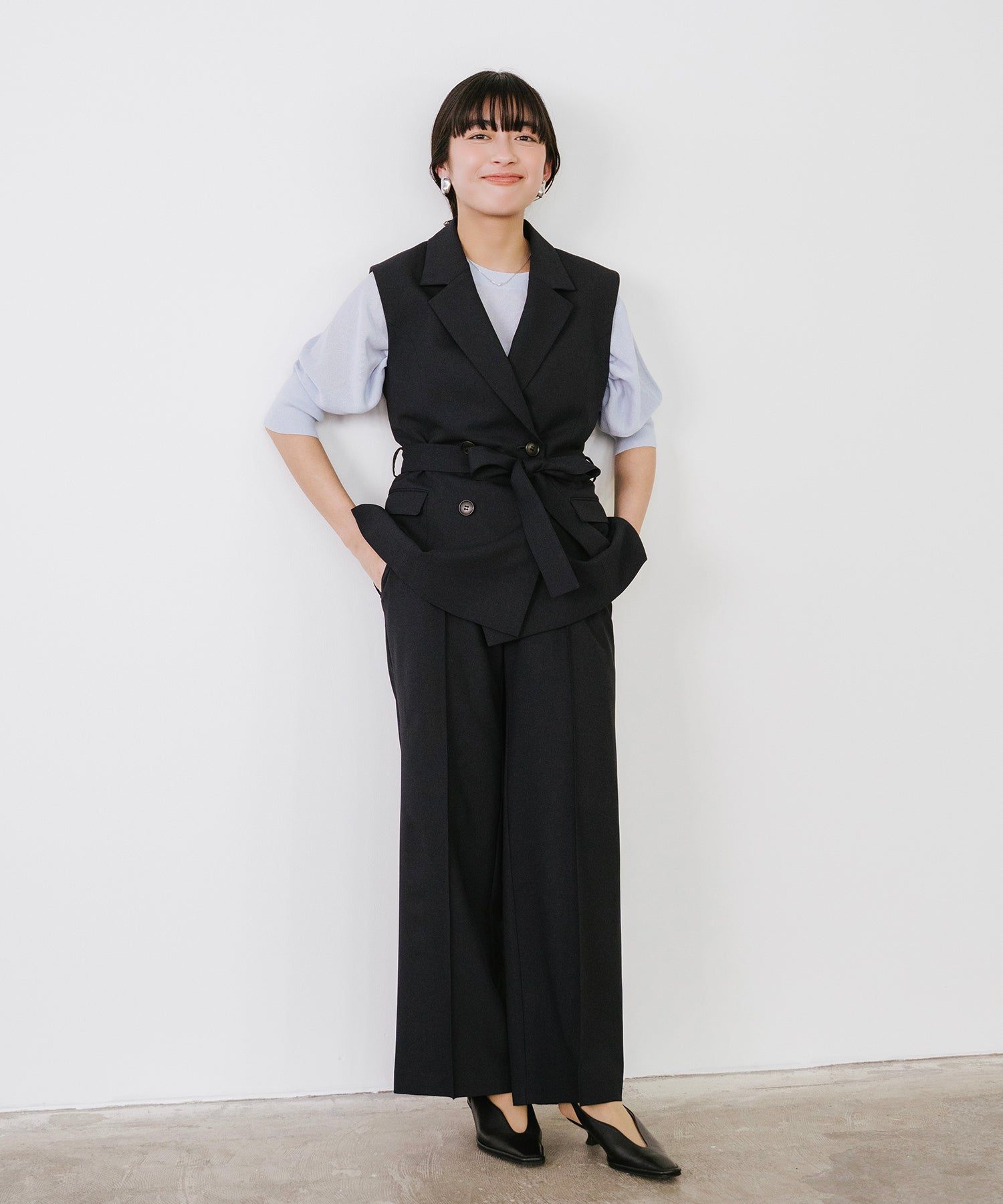 同素材のジレと合わせて、お仕事にも公式の場にも似合うコーディネートに。
