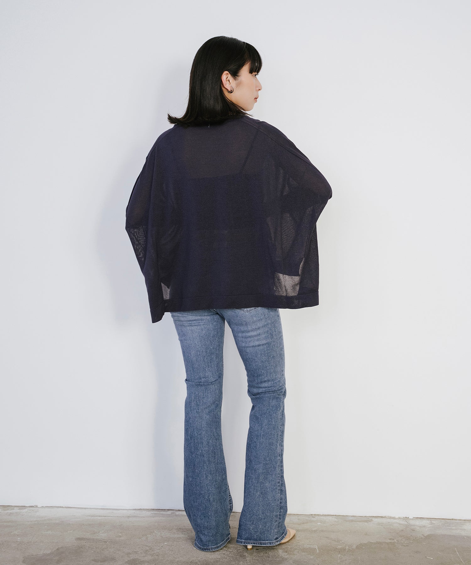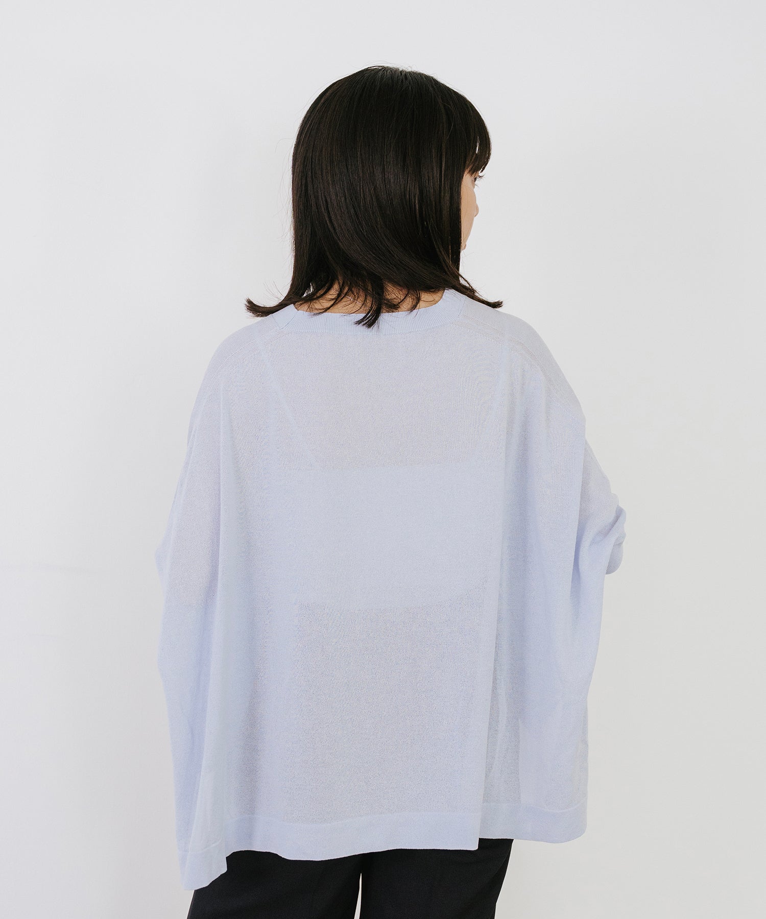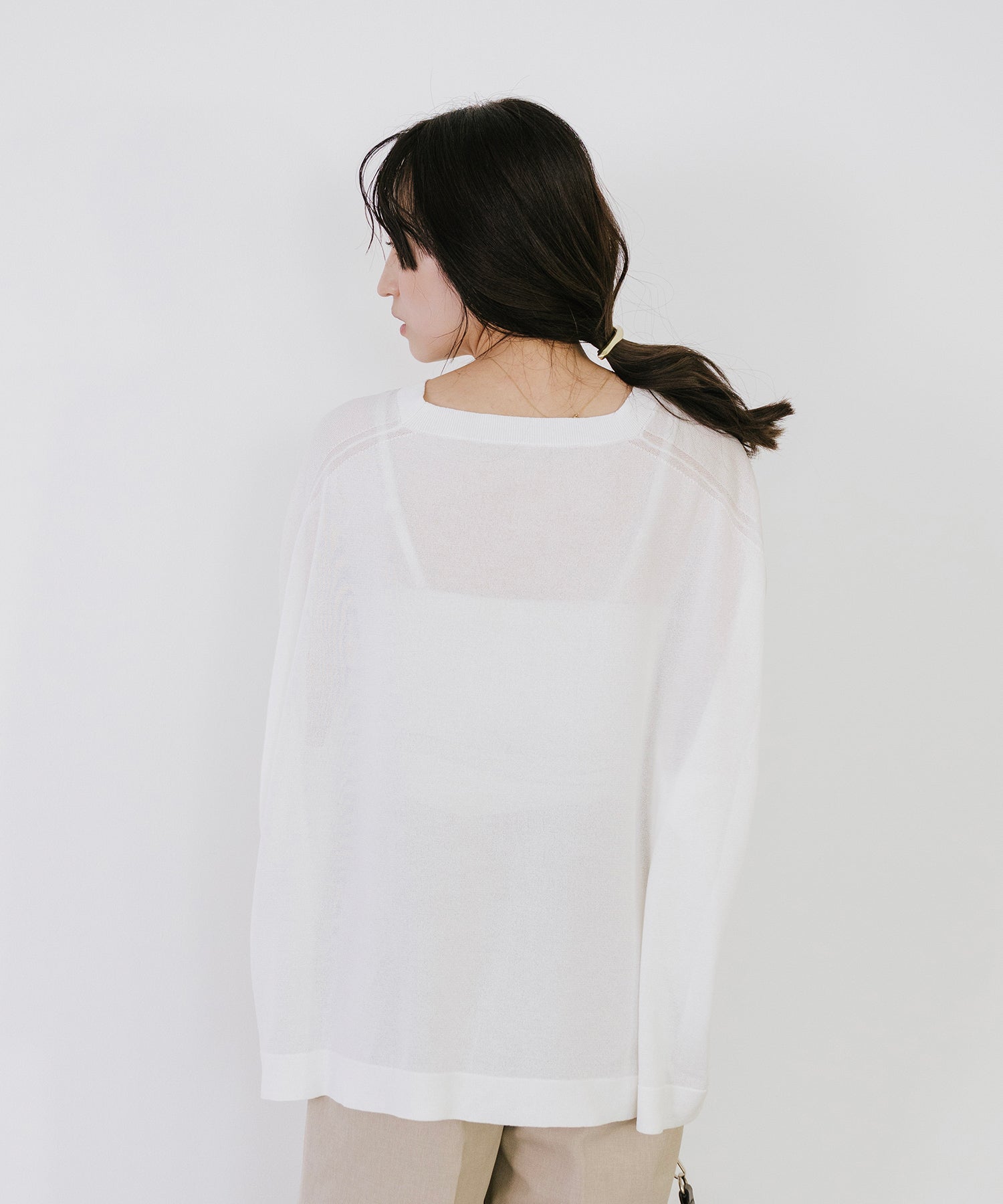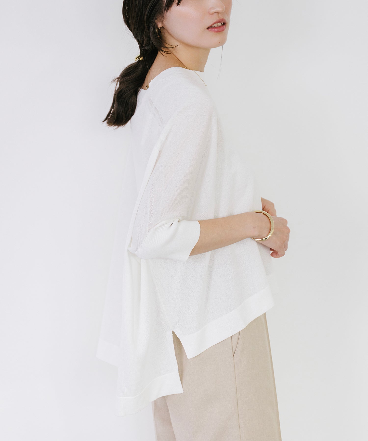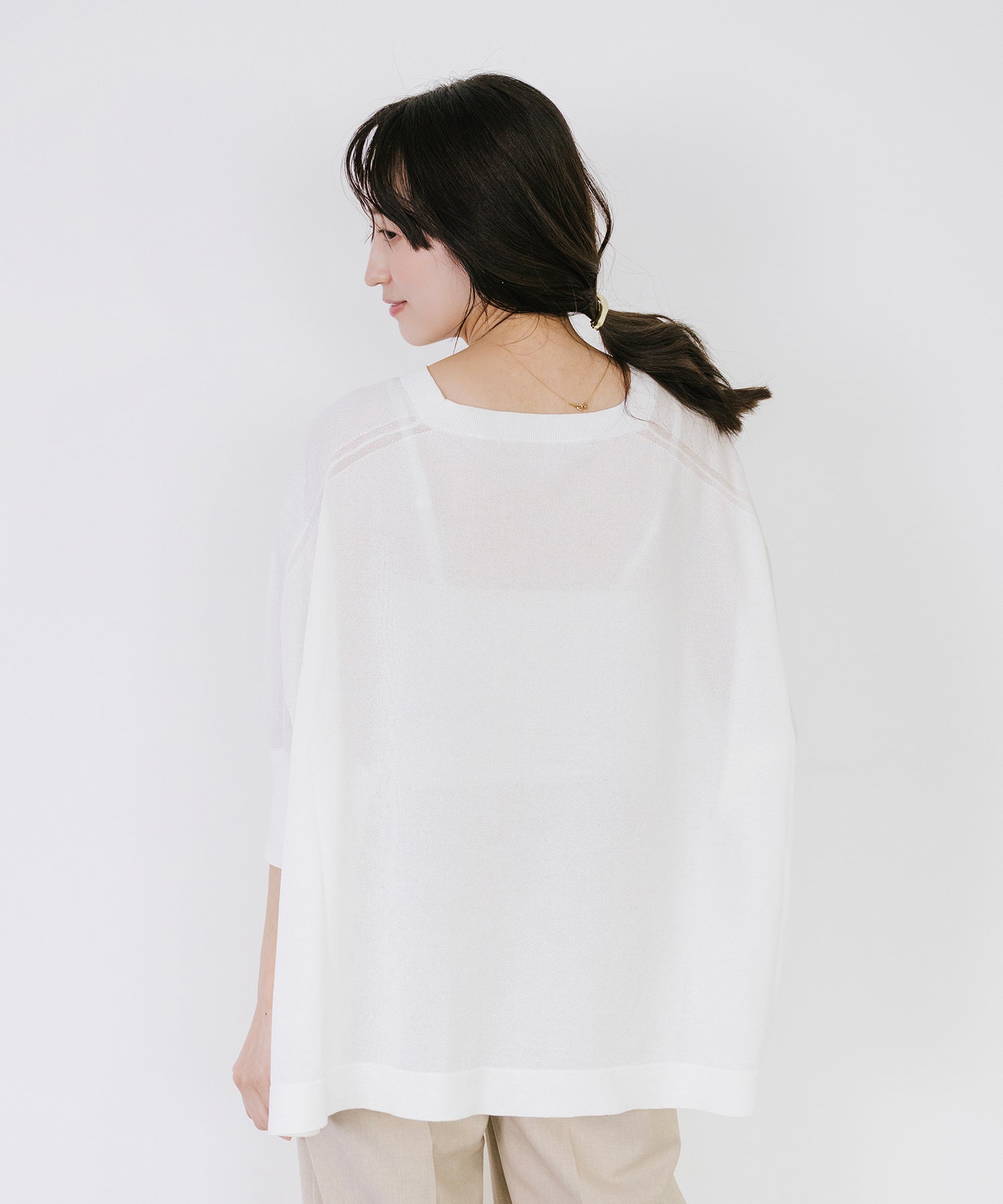 動くたびに揺れる編地が涼しげな印象を与え、シンプルなコーディネートにさらっと合わせるだけで着映えする一枚。