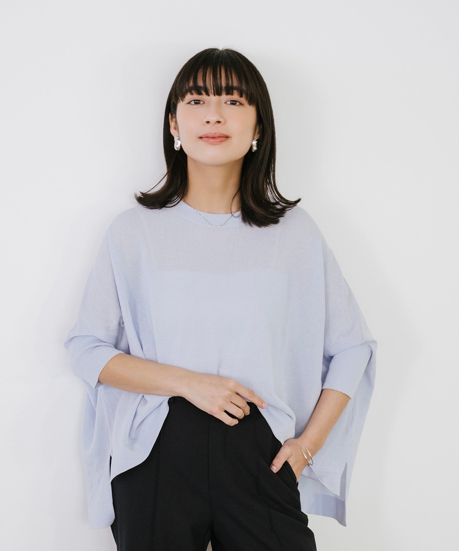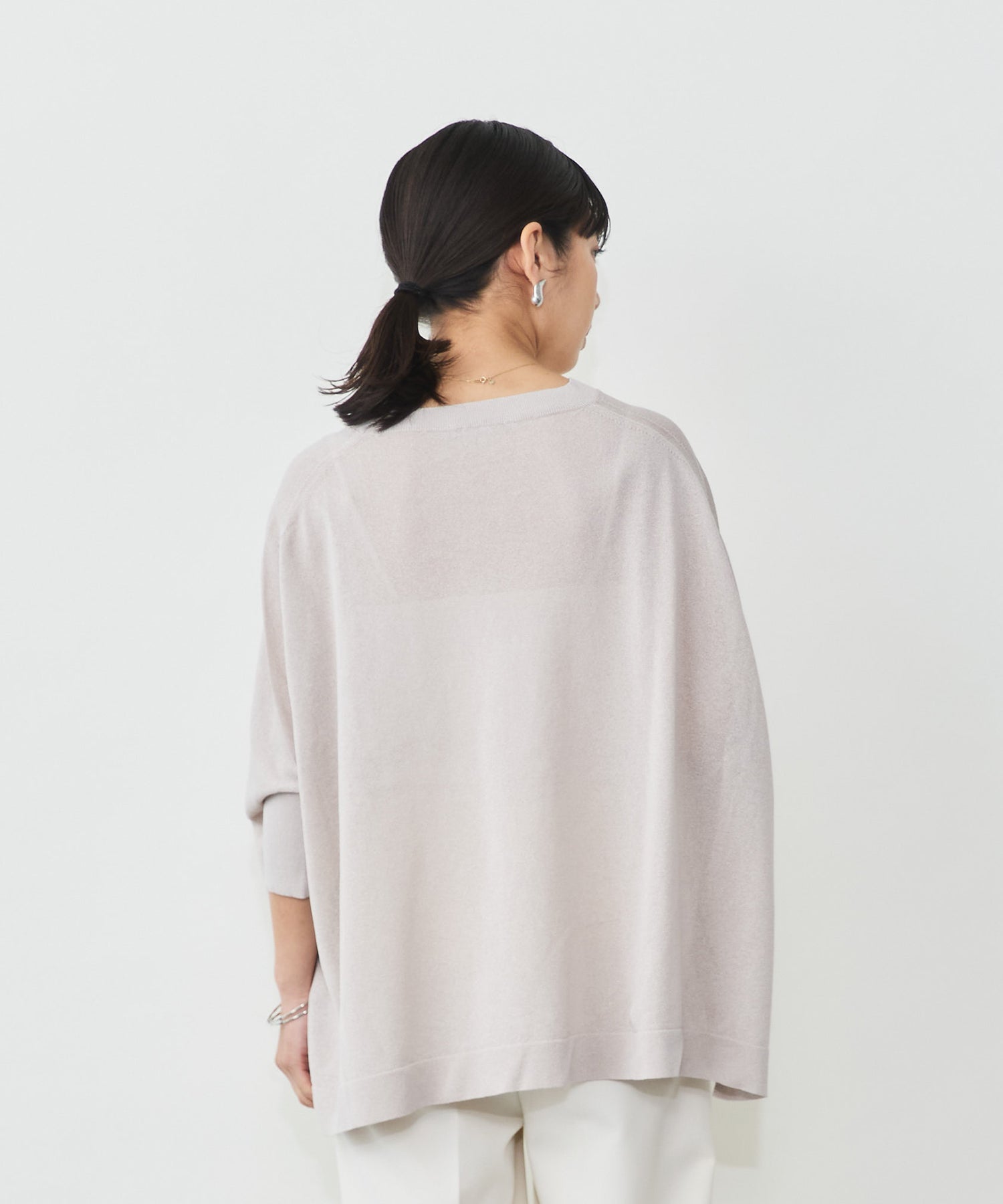 ポンチョならではのゆったりとしたシルエットが、身体のラインを自然にカバーし、抜け感のあるスタイリングを演出します。